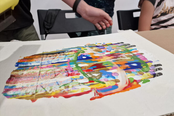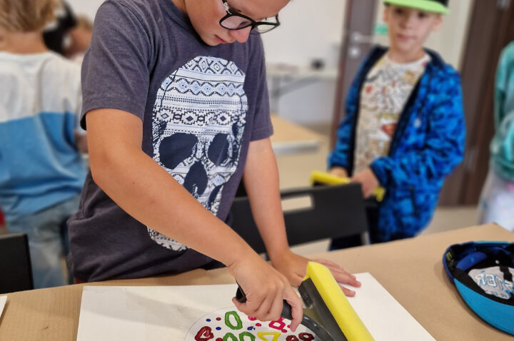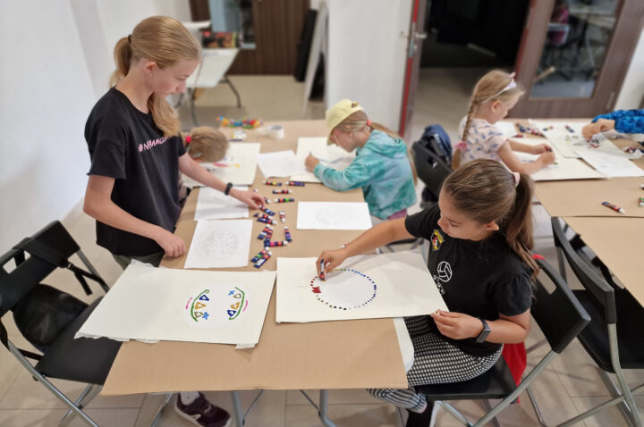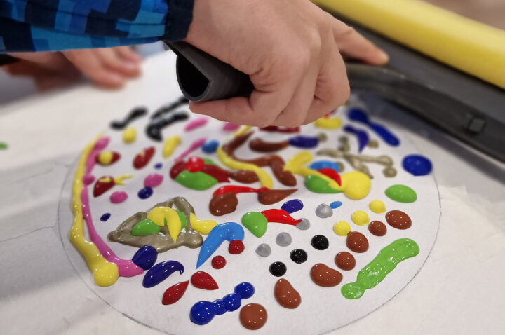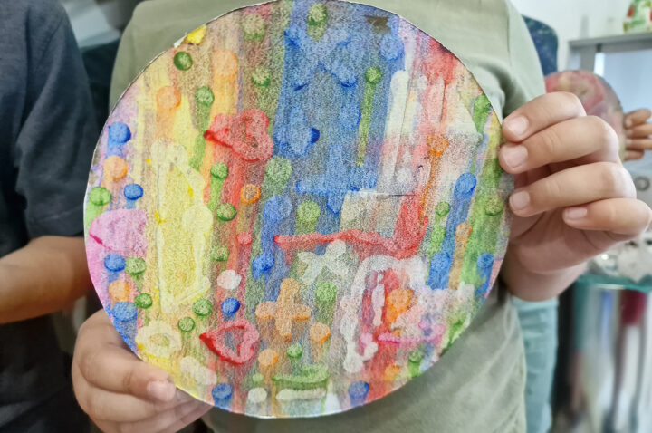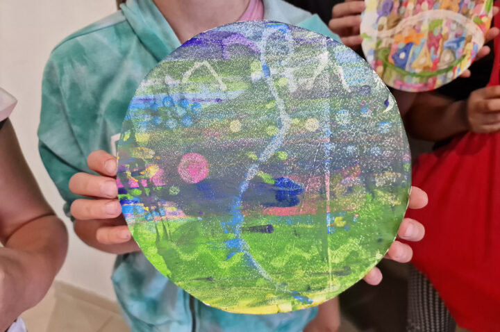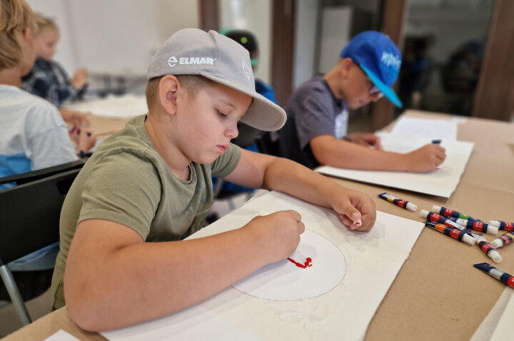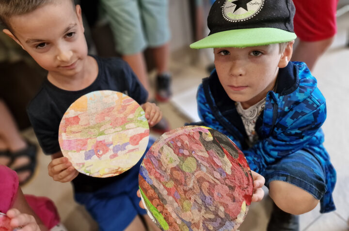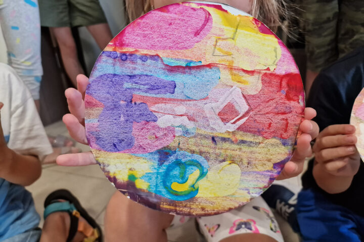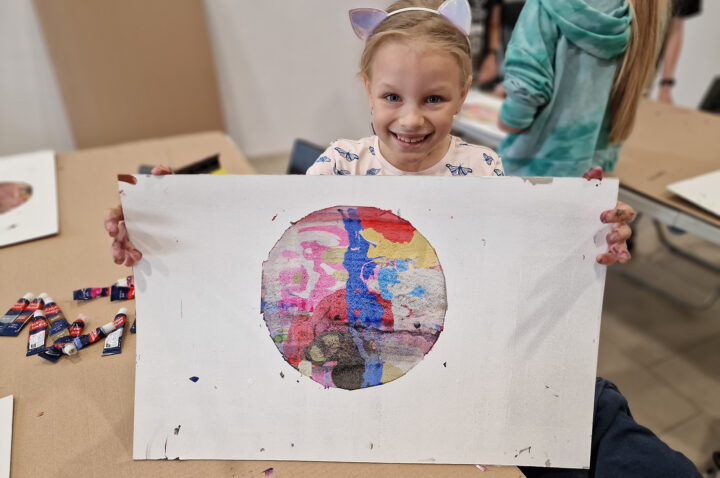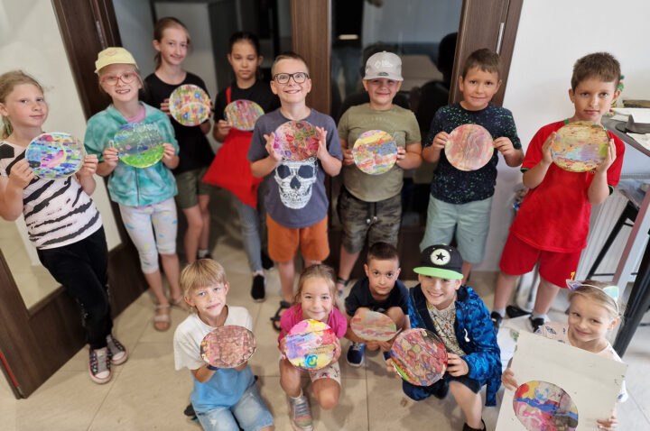 „Kolorowe Koła” to abstrakcje tworzone przez dzieci za pomocą ciekawej techniki plastycznej z użyciem farb akrylowych oraz ściągaczki. W oparciu o wcześniej przygotowany projekt uczestnicy zajęć stworzyli matrycę, w której główną rolę odegrało koło. Na kole pojawiły się barwne plamki, kreski i inne kształty wymyślone przez dzieci, które następnie zostały roztarte po polu koła.