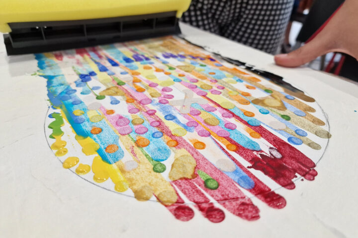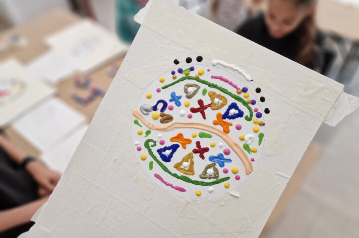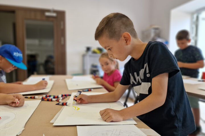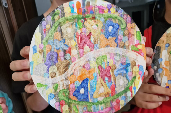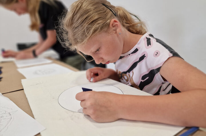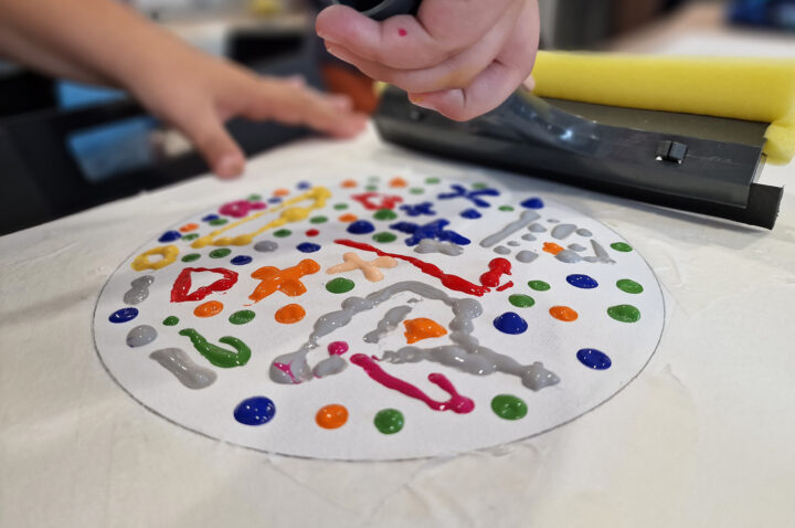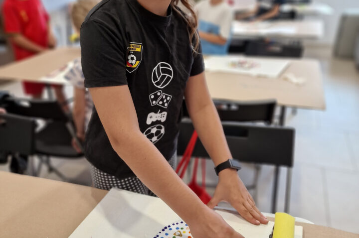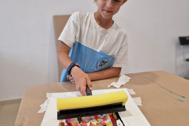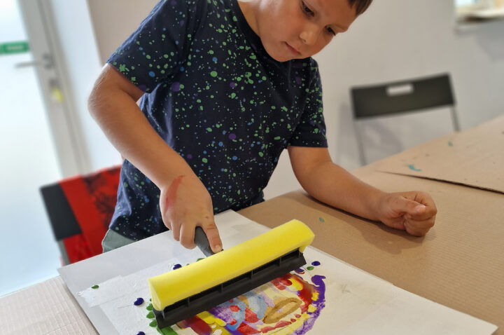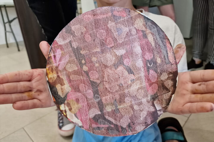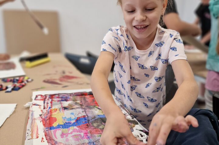 „Kolorowe Koła” to abstrakcje tworzone przez dzieci za pomocą ciekawej techniki plastycznej z użyciem farb akrylowych oraz ściągaczki. W oparciu o wcześniej przygotowany projekt uczestnicy zajęć stworzyli matrycę, w której główną rolę odegrało koło. Na kole pojawiły się barwne plamki, kreski i inne kształty wymyślone przez dzieci, które następnie zostały roztarte po polu koła.