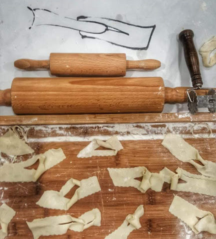 • ciasto rozwałkować na cienki placek, wycinać z niego paski, nacinać w środku i przewijać na drugą stronę
